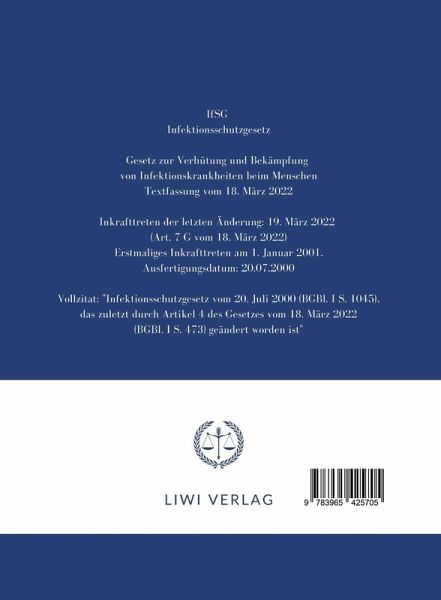 Das Infektionsschutzgesetz IfSG als Taschenbuch in gut lesbarer Schriftgröße auf dem aktuellen Stand 2022. Letzte Änderung: Textfassung vom 18. März 2022, Inkrafttreten: 19. März 2022Erstmaliges Inkrafttreten am 1. Januar 2001.Vollständiger Titel: "Gesetz zur Verhütung und Bekämpfung von Infektionskrankheiten beim Menschen", Kurztitel: "Infektionsschutzgesetz"Vollzitat: "Infektionsschutzgesetz vom 20. Juli 2000 (BGBl. I S. 1045), das zuletzt durch Artikel 4 des Gesetzes vom 18. März 2022 (BGBl. I S. 473) geändert worden ist"Aus dem Inhalt:Koordinierung und epidemische Lage von nationaler TragweiteÜberwachungVerhütung übertragbarer KrankheitenBekämpfung übertragbarer KrankheitenWasserGesundheitliche Anforderungen an das Personal beim Umgang mit LebensmittelnTätigkeiten mit KrankheitserregernVollzug des Gesetzes und zuständige BehördenAngleichung an GemeinschaftsrechtEntschädigung in besonderen FällenRechtsweg und KostenSondervorschriftenStraf- und BußgeldvorschriftenÜbergangsvorschriftenNeuausgabe, LIWI Verlag, Göttingen 2022.LIWI Literatur- und Wissenschaftsverlag
