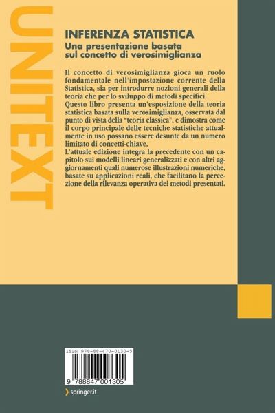 Il concetto di verosimiglianza gioca un ruolo fondamentale nell'impostazione corrente della Statistica, sia per introdurre nozioni generali della teoria che per lo sviluppo di metodi specifici. Questo libro presenta un'esposizione della teoria statistica basata sulla verosimiglianza, osservata dal punto di vista della "teoria classica", e dimostra come il corpo principale delle tecniche statistiche attualmente in uso possano essere desunte da un numero limitato di concetti-chiave. L'attuale edizione integra la precedente con un capitolo sui modelli lineari generalizzati e con altri aggiornamenti quali numerose illustrazioni numeriche, basate su applicazioni reali, che facilitano la percezione della rilevanza operativa dei metodi presentati.