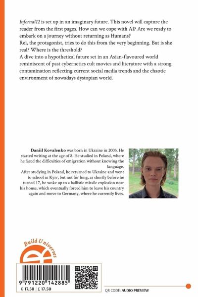 Infernal12 is set up in an imaginary future. This novel will capture the reader from the first pages. How can we cope with AI? Are we ready to embark on a journey without returning as Humans? Rei, the protagonist, tries to do this from the very beginning. But is she real? Where is the threshold? A dive into a hypothetical future set in an Asian-flavoured world reminiscent of past cybernetics cult movies and literature with a strong contamination reflecting current social media trends and the chaotic environment of nowadays dystopian world. Daniil Kovalenko was born in Ukraine in 2005. He started writing at the age of 8. He studied in Poland, where he faced the difficulties of emigration without knowing the language. After studying in Poland, he returned to Ukraine and went to school in Kyiv, but not for long, as shortly before he turned 17, he woke up to a ballistic missile explosion near his house, which eventually forced him to leave his country again and move to Germany, where he currently lives.