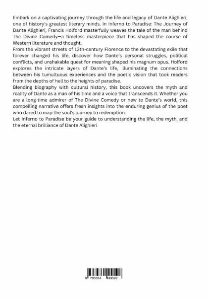 Embark on a captivating journey through the life and legacy of Dante Alighieri, one of history's greatest literary minds. In Inferno to Paradise: The Journey of Dante Alighieri, Francis Holford masterfully weaves the tale of the man behind The Divine Comedy-a time-less masterpiece that has shaped the course of Western literature and thought.From the vibrant streets of 13th-century Florence to the devastating exile that forever changed his life, discover how Dante's personal struggles, political conflicts, and unshakable quest for meaning shaped his magnum opus. Holford explores the intricate layers of Dante's life, illuminating the connections between his tumultuous experiences and the poetic vision that took readers from the depths of hell to the heights of paradise.Blending biography with cultural history, this book uncovers the myth and reality of Dante as a man of his time and a voice that transcends it. Whether you are a long-time admirer of The Divine Comedy or new to Dante's world, this compelling narrative offers fresh insights into the enduring genius of the poet who dared to map the soul's journey to redemption.Let Inferno to Paradise be your guide to understanding the life, the myth, and the eternal brilliance of Dante Alighieri.
