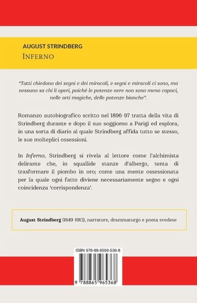 Romanzo autobiografico scritto nel 1896-97 tratta della vita di Strindberg durante e dopo il suo soggiorno a Parigi ed esplora, in una sorta di diario al quale Strindberg affida tutto se stesso, le sue molteplici ossessioni. La sua vita fu, come noto, una successione di cataclismi: il più brutale e, nel contempo, fecondo, fu proprio quello del 1895, quando, a Parigi, la 'mano dell'invisibile' lo precipitò in un'esperienza sconvolgente, catapultandolo in un susseguirsi di paranoie che ne tormentavano l'animo. In "Inferno", Strindberg si rivela al lettore come l'alchimista delirante che, in squallide stanze d'albergo, tenta di trasformare il piombo in oro; come una mente ossessionata per la quale ogni fatto diviene necessariamente segno e ogni coincidenza 'corrispondenza'. La sua scrittura ci conduce così tra il dramma cosmico e la farsa, tra il soprannaturale e il quotidiano, in una concatenazione di eventi che paiono condurlo a un sempre più tragico destino.