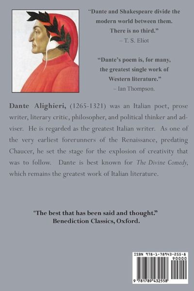 "Dante and Shakespeare divide the modern world between them. There is no third." - T. S. Eliot "Dante's poem is, for many, the greatest single work of Western literature." - Ian Thompson. "I love my Dante as much as the Bible. He is my spiritual food, the rest is ballast." - James Joyce. In the middle of our life's journey, I found myself in a dark wood/Bewildered, and I knew I had lost the way: so opens Dante's Divine Comedy, "the best book literature has achieved" as Jorge Luis Borges writes. Dante's Inferno, one of the greatest works of European literature, and "the most original and audacious treatment of the afterlife in Western literature" dazzles with its vivid and inventive storytelling and imagery. However, it contains much more than poetry and theology; it displays Dante's wide and comprehensive learning, and his deep understanding of contemporary politics and society. "All life is contained in the poem, for Dante's was an all-encompassing imagination, that interwove classical philosophy with Catholic doctrine and contemporary politics," (Ian Thompson). The thirty-three cantos of Inferno follow Dante, as, guided by the epic poet, Virgil, he travels through the nine descending circles of a freezing Hell, until he meets Satan trapped at the bottom. The Inferno is the most gripping and engaging book of The Divine Comedy, as Dante meets those damned for forbidden love, and all manner of human vices. (The damned, amusingly, include many of Dante's enemies!) Inferno is the logical conclusion of all that is worst in human life. It is bearable only because Dante eventually emerges. The Divine Comedy was written over a period of twenty years towards the end of Dante's life. It was appreciated as a masterpiece soon after its completion, and it has captivated both readers and the Western imagination ever since. The Inferno is the most widely translated book after the Bible. This edition is translated by the celebrated poet, Henry Wadsworth Longfellow. Dante Alighieri, (1265-1321) was an Italian poet, prose writer, literary critic, philosopher, and political thinker and adviser. He is regarded as the greatest Italian writer. As one of the earliest forerunners of the Renaissance, predating Chaucer, he set the stage for the explosion of creativity that was to follow. Dante is best known for The Divine Comedy, which remains the greatest work of Italian literature.