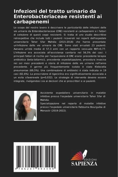 Lo scopo del nostro lavoro è descrivere le particolarità delle infezioni delle vie urinarie da Enterobacteriaceae (CRE) resistenti ai carbapenemi e i fattori di selezione di questi ceppi resistenti. Si tratta di uno studio descrittivo retrospettivo che include tutti i pazienti ricoverati nei reparti dell'ospedale universitario Taher Sfar Mahdia (2015-2018) che hanno presentato un'infezione delle vie urinarie da CRE. Sono stati arruolati 23 pazienti. Avevano un'età media di 57,3 anni con un rapporto sessuale M/F=0,77. L'infezione era associata all'assistenza sanitaria nel 56,5% dei casi. I principali fattori di rischio per l'acquisizione di ERC erano: precedente terapia antibiotica (beta-lattamici), precedente ospedalizzazione, procedura invasiva nei sei mesi precedenti e storia di infezione delle vie urinarie nell'anno precedente. Il germe più frequentemente isolato è stato Klebsiella pneumoniae (69,5%). Una combinazione di antibiotici è stata indicata in 19 casi (82,6%). La prescrizione di tigeciclina era significativamente associata a un esito sfavorevole (p=0,032). Le strategie di intervento devono essere integrate, rivolgendosi sia ai decisori che ai prescrittori e ai pazienti.