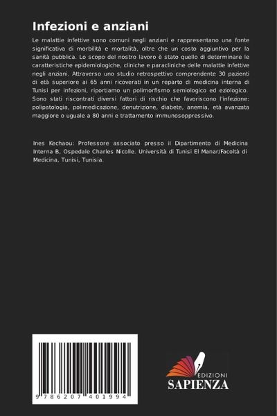 Le malattie infettive sono comuni negli anziani e rappresentano una fonte significativa di morbilità e mortalità, oltre che un costo aggiuntivo per la sanità pubblica. Lo scopo del nostro lavoro è stato quello di determinare le caratteristiche epidemiologiche, cliniche e paracliniche delle malattie infettive negli anziani. Attraverso uno studio retrospettivo comprendente 30 pazienti di età superiore ai 65 anni ricoverati in un reparto di medicina interna di Tunisi per infezioni, riportiamo un polimorfismo semiologico ed eziologico. Sono stati riscontrati diversi fattori di rischio che favoriscono l'infezione: polipatologia, polimedicazione, denutrizione, diabete, anemia, età avanzata maggiore o uguale a 80 anni e trattamento immunosoppressivo.