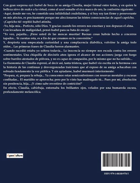 Con gran sorpresa oyó Isabel de boca de su amiga Claudia, mujer formal entre todas, y en quien la belleza sirve de realce a la virtud, como al azul esmalte el rico marco de oro, la confesión siguiente: -Aquí, donde me ves, he cometido una infidelidad crudelísima, y si hoy soy tan firme y perseverante en mis afectos, es precisamente porque me aleccionaron las tristes consecuencias de aquel capricho. -¡Capricho tú! -repitió Isabel atónita. -Yo, hija mía... Perfecto, sólo Dios. Y gracias cuando los errores nos enseñan y nos depuran el alma. Con levadura de malignidad, pensó Isabel para su bata de encaje: "Te veo, pajarita... ¡Fíese usted de las moscas muertas! Buenas cosas habrás hecho a cencerros tapados... Si cuentas esta, es a fin de que creamos en tu conversión." Y, despierta una empecatada curiosidad y una complacencia diabólica, volvióse la amiga todo oídos... Las primeras frases de Claudia fueron alarmantes. -Cuando sucedió estaba yo soltera todavía... La inocencia no siempre nos escuda contra los errores sentimentales. Una chiquilla de dieciséis años ignora el alcance de sus acciones; juega con fuego sobre barriles atestados de pólvora, y no es capaz de compasión, por lo mismo que no ha sufrido... La fisonomía de Claudia expresó, al decir así, tanta tristeza, que Isabel vio escrita en la hermosa cara la historia de las continuas y desvergonzadas traiciones que al esposo de su amiga achacaban con sobrado fundamento la voz pública. Y sin apiadarse, Isabel murmuró interiormente: "Prepara, sí, prepara la rebaja... Ya conocemos estas semiconfesiones con reservas mentales y excusas confitadas... El maridito se aprovecha; pero por lo visto has madrugado tú... Pues por mí, absolución sin penitencia, hija... ¡Y cómo sabe revestirse de contrición!" En efecto, Claudia, cabizbaja, entornaba los brillantes ojos, velados por una humareda oscura, profundamente melancólica.