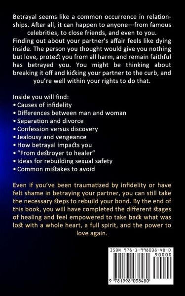 Betrayal seems like a common occurrence in relationships. After all, it can happen to anyone-from famous celebrities, to close friends, and even to you. Finding out about your partner's affair feels like dying inside. The person you thought would give you nothing but love, protect you from all harm, and remain faithful has betrayed you. You might be thinking about breaking it off and kicking your partner to the curb, and you're well within your rights to do that. Inside you will find:Causes of infidelity Differences between man and woman Separation and divorce Confession versus discovery Jealousy and vengeance How betrayal impacts you "From destroyer to healer" Ideas for rebuilding sexual safety Common mistakes to avoid Even if you've been traumatized by infidelity or have felt shame in betraying your partner, you can still take the necessary steps to rebuild your bond. By the end of this book, you will have completed the different stages of healing and feel empowered to take back what was lost with a whole heart, a full spirit, and the power to love again.