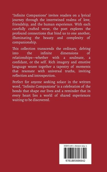 "Infinite Companions" invites readers on a lyrical journey through the intertwined realms of love, friendship, and the human experience. With each carefully crafted verse, the poet explores the profound connections that bind us to one another, illuminating the beauty and complexity of companionship. This collection transcends the ordinary, delving into the infinite dimensions of relationships-whether with a soulmate, a confidant, or the self. Rich imagery and emotive language weave together a tapestry of moments that resonate with universal truths, inviting reflection and introspection. Perfect for anyone seeking solace in the written word, "Infinite Companions" is a celebration of the bonds that shape our lives and a reminder that in every heart lies a world of shared experiences waiting to be discovered.