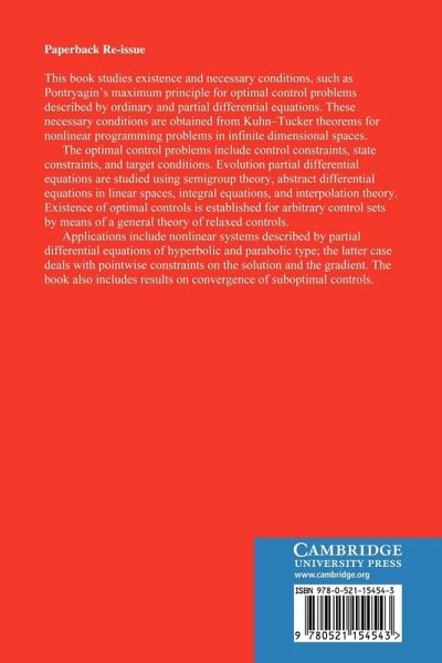 This book is on existence and necessary conditions, such as Potryagin's maximum principle, for optimal control problems described by ordinary and partial differential equations. These necessary conditions are obtained from Kuhn-Tucker theorems for nonlinear programming problems in infinite dimensional spaces. The optimal control problems include control constraints, state constraints and target conditions. Evolution partial differential equations are studied using semigroup theory, abstract differential equations in linear spaces, integral equations and interpolation theory. Existence of optimal controls is established for arbitrary control sets by means of a general theory of relaxed controls. Applications include nonlinear systems described by partial differential equations of hyperbolic and parabolic type and results on convergence of suboptimal controls.