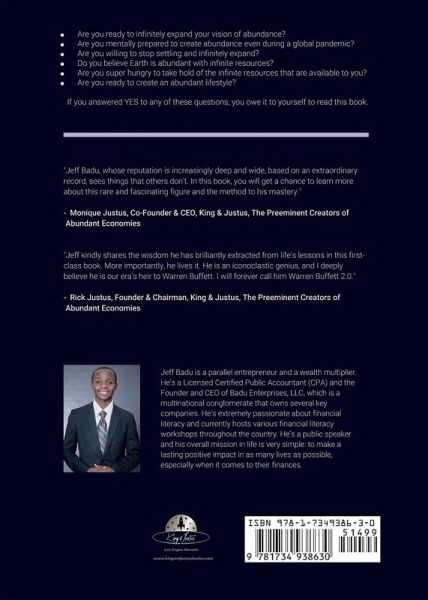 Do you believe Earth is abundant with infinite resources? Are you super hungry to take hold of the infinite resources that are available to you? Are you ready to create an abundant lifestyle? Are you ready to infinitely expand your vision of abundance? Are you mentally prepared to create abundance even during a global pandemic? Are you willing to stop settling and infinitely expand? If you answered YES to any of these questions, you owe it to yourself and your future to read this book. Everyone has their own profound purpose in life, and Jeff Badu would say that his real purpose is helping people take a resource that already exists in order to create an abundant lifestyle. In this book, what you'll find are twelve steps to ultimately create the abundant lifestyle you desire. You can be as great as you want if only you say you can. About the Author: Jeff Badu is a parallel entrepreneur and a wealth multiplier. He's a Licensed Certified Public Accountant (CPA) and the Founder and CEO of Badu Enterprises, LLC, which is a multinational conglomerate that owns several key companies. Jeff has a passion for helping people minimize their tax liability and ultimately, multiplying their money by investing it and building multi-generational wealth.