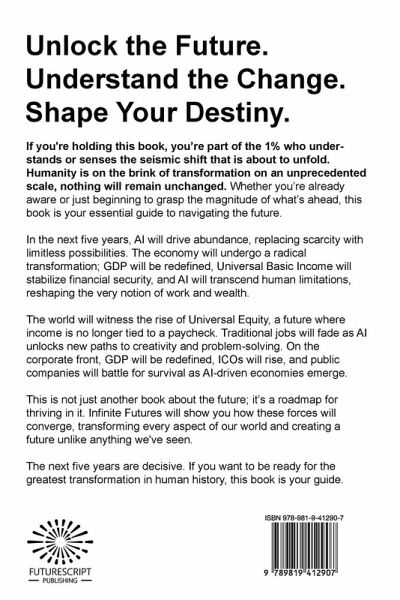 Unlock the Future. Understand the Change. Shape Your Destiny. If you're holding this book, you're part of the 1% who understands or senses the seismic shift that is about to unfold. Humanity is on the brink of transformation on an unprecedented scale, nothing will remain unchanged. Whether you're already aware or just beginning to grasp the magnitude of what's ahead, this book is your essential guide to navigating the future. In the next five years, AI will drive abundance, replacing scarcity with limitless possibilities. The economy will undergo a radical transformation; GDP will be redefined, Universal Basic Income will stabilize financial security, and AI will transcend human limitations, reshaping the very notion of work and wealth. The world will witness the rise of Universal Equity, a future where income is no longer tied to a paycheck. Traditional jobs will fade as AI unlocks new paths to creativity and problem-solving. On the corporate front, GDP will be redefined, ICOs will rise, and public companies will battle for survival as AI-driven economies emerge. This is not just another book about the future; it's a roadmap for thriving in it. Infinite Futures will show you how these forces will converge, transforming every aspect of our world and creating a future unlike anything we've seen. The next five years are decisive. If you want to be ready for the greatest transformation in human history, this book is your guide.