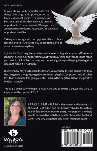 In your life you will encounter only two things: blessings and opportunities to learn lessons. All positive experiences are blessings and all less-than-desirable ones are opportunities to learn lessons. When you have an opportunity to learn a lesson, you also have an opportunity to Heal. Taking advantage of the opportunities to learn lessons and to Heal is the key to creating a life of abundance—in everything. Infinite Healing™ requires you to Honor everything about yourself because ignoring, denying, or suppressing what you really think and feel does not mean you do not think or feel that way and because ignoring or denying the negative does not mean it is not there. Discover how easy it is to learn the lessons you are here to learn and how to Truly Heal negative thoughts, negative emotions, physical symptoms, and all other less-than-desirable things in your life. Healing the negative allows the positive to flow naturally. Today is a great day to begin to Truly Heal and to create a better life! Dare to experience the power of You!