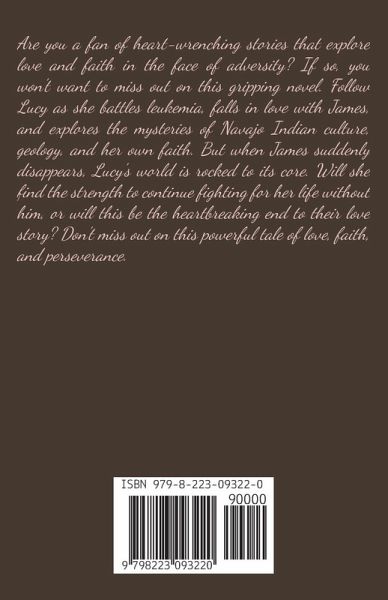 Are you a fan of heart-wrenching stories that explore love and faith in the face of adversity? If so, you won't want to miss out on this gripping novel. Follow Lucy as she battles leukemia, falls in love with James, and explores the mysteries of Navajo Indian culture, geology, and her own faith. But when James suddenly disappears, Lucy's world is rocked to its core. Will she find the strength to continue fighting for her life without him, or will this be the heartbreaking end to their love story? Don't miss out on this powerful tale of love, faith, and perseverance.
