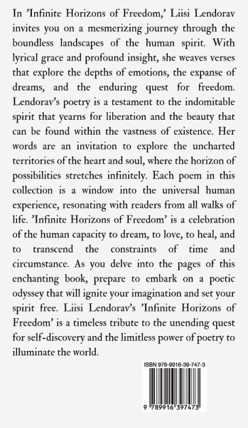 In 'Infinite Horizons of Freedom,' Liisi Lendorav invites you on a mesmerizing journey through the boundless landscapes of the human spirit. With lyrical grace and profound insight, she weaves verses that explore the depths of emotions, the expanse of dreams, and the enduring quest for freedom.Lendorav's poetry is a testament to the indomitable spirit that yearns for liberation and the beauty that can be found within the vastness of existence. Her words are an invitation to explore the uncharted territories of the heart and soul, where the horizon of possibilities stretches infinitely.Each poem in this collection is a window into the universal human experience, resonating with readers from all walks of life. 'Infinite Horizons of Freedom' is a celebration of the human capacity to dream, to love, to heal, and to transcend the constraints of time and circumstance.As you delve into the pages of this enchanting book, prepare to embark on a poetic odyssey that will ignite your imagination and set your spirit free. Liisi Lendorav's 'Infinite Horizons of Freedom' is a timeless tribute to the unending quest for self-discovery and the limitless power of poetry to illuminate the world. Copyright (c) 2024 Swan Charm Publishing