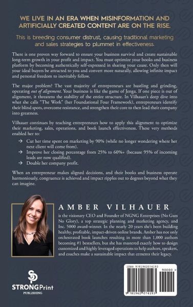 We live in an era when misinformation and artificially created content are on the rise. This is breeding consumer distrust, causing traditional marketing and sales strategies to plummet in effectiveness. There is one proven way forward to ensure your business survival and create sustainable long-term growth in your profit and impact. You must optimize your books and business platform by becoming authentically self-expressed in sharing your cause. Only then will your ideal buyers be attracted to you and convert more naturally, allowing infinite impact and personal freedom to inevitably follow. The major problem? The vast majority of entrepreneurs are hustling and grinding, operating out of alignment. Your business is like the game of Jenga. If one piece is out of alignment, it threatens the stability of the entire structure. In Vilhauer's deep dive into what she calls "The Work" (her Foundational Four Framework), entrepreneurs identify their blind spots, overcome resistance, and strengthen their core to then lead their company into greatness. Vilhauer continues by teaching entrepreneurs how to apply this alignment to optimize their marketing, sales, operations, and book launch effectiveness. These very methods enabled her to: ¿ Cut her time spent on marketing by 90% (while no longer wondering where her next client will come from). ¿ Improve her closing percentage from 25% to 60%+ (because 95% of incoming leads are now qualified). ¿ Double her company profit. When an entrepreneur makes aligned decisions, and their books and business operate harmoniously, congruence is achieved and impact ripples out to degrees beyond what they can imagine.