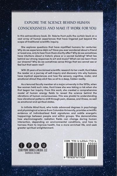 Explore the Science Behind Human Consciousness and Make It Work for You In this extraordinary book, Dr. Valerie Hunt pulls the curtain back on a vast array of human experiences that have lingered just beyond the scope of traditional scientific inquiry. She explores questions that have mystified humans for centuries: Why do we experience déjà vu? Have you ever wondered about a friend or loved one, only to hear from them shortly after? Why do we sometimes have intuitions about a historic place or a sacred building? What lies behind our strong responses to art and music? What can we learn from our dreams? Why do we sometimes sense things that we cannot see or feel but that seem real? With 25 years of acclaimed scientific research to her credit, Hunt takes the reader on a journey of self-inquiry and discovery into why humans have mystical experiences and how the sensory, cognitive, motor, and emotional stimuli they elicit ties us all to a deep, hidden reality. As a tenured faculty member at a major university in the 1970s, when few women held such roles, Hunt knew she was taking a risk when she first began her inquiry. From this work, she created a comprehensive model of human energy fields to reveal the science behind the vibrations of human consciousness. This was pivotal to understanding how vibrational patterns shift through pain, disease, and illness, as well as emotional and spiritual states. In Infinite Mind Hunt, who holds advanced degrees in psychology and physiological science from Columbia University, provides scientific evidence of individualized field signatures and subtle energetic happenings between people and within groups. She demonstrates how electromagnetic radiation fields can change during human interaction, depending on environmental conditions, and how to harness them to improve health, live a more enriched life, and seek greater spiritual enlightenment. This book is also available from Echo Point Books as a hardcover (ISBN 1635619610).