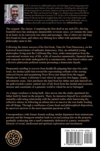 The original. The classic. Completing the first draft in my mid-20's, this big, beautiful mess has undergone innumerable revisions since, yet remains the same in its heart; in its conveyed core ideas and messages. This is where my ideology first found its form, and where my lifelong love affair with spirituality and philosophy came to life: Following the minor success of his first book, Time for True Democracy, on the historical nonexistence of authentic democracy, Alex, an embattled young philosopher living near the California Bay Area, seeks emancipation from the conventional western way of life, a life of ceaseless unnaturality, financial duress and corporate servitude undergirded by a consumeristic, class-based culture and a divisive plutocratic political system presenting a democratic façade. Desperately needing to recover from health ills plaguing him since his early teens, his instinct pulls him toward the rejuvenating solitude of the soaring redwood forests and meandering Noyo River just inland from the rugged Mendocino County, California Coast where he spent his first happy, simple, adventurous years. Alex purchases the land from his father and puts himself on the path towards a purer, natural way of life freed from the mental and economic stresses and constraints of a parasitic world to which he never belonged. As a larger residence is being built, Alex moves into the studio apartment his father built by hand on the property. There, he immerses himself in a symbiotic, mutually-cultivating relationship with the natural realm while harnessing the reflective silence in following an inborn drive to uncover the root truths feeding into all things. Through a confluence of pure heart and philosophical disposition, he uncovers answers to the most important questions in life. Correspondence with former friends seeking similar departures from mainstream pursuits and the bourgeois mindset leads to several joining him on the property, gradually coalescing into a small community dedicated to a purer, sustainable lifestyle of social, intellectual and spiritual exploration and enrichment.
