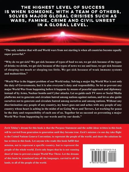 Zerit Teklay is the author of this book. The biggest dream of the Author of this book is to achieve his purpose statement Dreams come true one day. The purpose statement of the Author says "Infinite Solutions: A Solution to Everything. One World. One Flag. One Constitution. If not in his lifetime, the Author of this book hopes his Purpose Statement and his noble ideas written in this book to be carried on from generation to generation until its noble ideas in this book become true. God forbid if something unexpected happen to the Author of this book, his first mission would be taking a flight to the United Nations Geneva convention representing the people of the world. If his first mission does not come true, let anyone who read this book pick up his First mission of representing the people of the World. Let anyone who pick up this book not represent a specific country. Let anyone who read this book represent the people of the entire world, not the people of a specific country. Whoever picks up the First mission of the Author of this book can refer to this book ideas on the United Nations Convention meeting and public speaking. The Author does not represent any specific country agenda, he only exclusively represents the people of all country's agenda. He does not represent any specific government agenda. Although the Author understand humanity will not totally perish by governments agendas of World wars and domination, The Author hopes not to run out of time on preventing a major World War three. He hopes he does not get assassinated like Martin Luther King was Assassinated before his dreams come true.let the Author of this book Zerit's dreams written in this book be thought is schools and Universities and let this book be translated to all the languages even after he is long gone. and let his noble mission and ideas be caried on in all lands by all the peoples of the World.