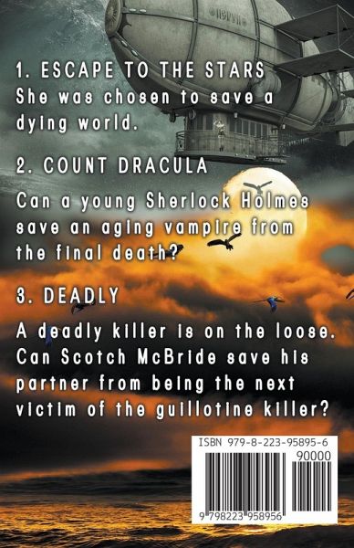 3 more fun reads, filled with exciting fantasy, mystery, urban fantasy, and science fiction tales that stretch the imagination. ESCAPE TO THE STARS Rusty has battled against pirates, been hunted down by a ghost man, ruled Atlantis, and now she faces the final days of her mission...help her long lost friends return home. COUNT DRACULA Sherlock Holmes is just starting his brilliant career as a detective, and already he is garnering a lot of criticism about how he handles cases. And this new case is going to be the largest of his life so far...saving Count Dracula's life! DEADLY A killer is loose in Glasgow, and leaves victims beheaded. Scotch McBride and his partner are hot on the killer's trail, or is it the other way around and the killer is hot on their trail? An exciting new adventure of a detective to rival Holmes.