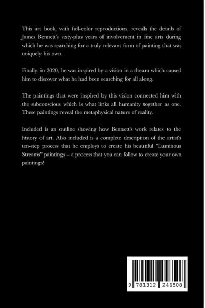 This art book, with full-color reproductions, reveals the details of James Bennett's sixty-plus years of involvement in fine arts during which he was searching for a truly relevant form of painting that was uniquely his own. Finally, in 2020, he was inspired by a vision in a dream which caused him to discover what he had been searching for all along. The paintings that were inspired by this vision connected him with the subconscious which is what links all humanity together as one. These paintings reveal the metaphysical nature of reality. Included is an outline showing how Bennett's work relates to the history of art. Also included is a complete description of the artist's ten-step process that he employs to create his beautiful "Luminous Streams" paintings -- a process that you can follow to create your own paintings!