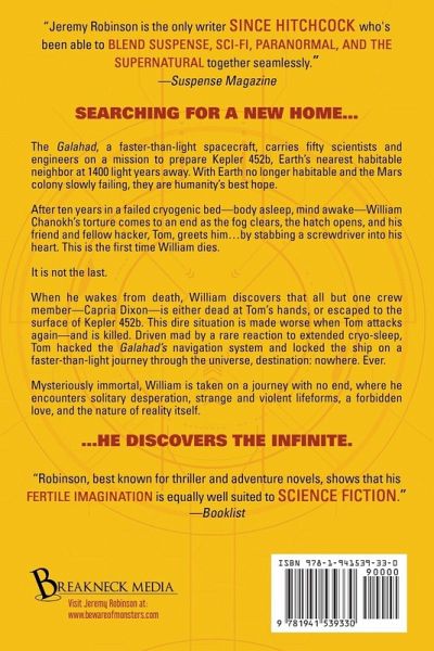 "The Galahad, a faster-than-light spacecraft, carries fifty scientists and engineers on a mission to prepare Kepler 452b, Earth's nearest habitable neighbor at 1400 light years away. With Earth no longer habitable and the Mars colony slowly failing, they are humanity's best hope. After ten years in a failed cryogenic bed -- body asleep, mind awake -- William Chanokh's torture comes to an end as the fog clears, the hatch opens, and his friend and fellow hacker, Tom, greets him ... by stabbing a screwdriver into his heart. This is the first time William dies. It is not the last. When he wakes from death, William discovers that all but one crew member -- Capria Dixon -- is either dead at Tom's hands, or escaped to the surface of Kepler 452b. This dire situation is made worse when Tom attacks again -- and is killed. Driven mad by a rare reaction to extended cryo-sleep, Tom hacked the Galahad's navigation system and locked the ship on a faster-than-light journey through the universe, destination: nowhere. Ever. Mysteriously immortal, William is taken on a journey with no end, where he encounters solitary desperation, strange and violent lifeforms, a forbidden love, and the nature of reality itself."--Publisher's description.