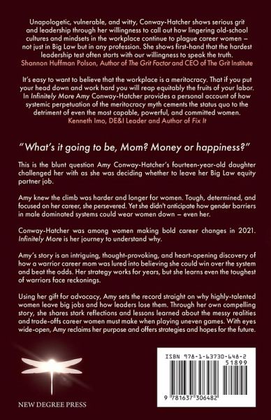 "What's it going to be, Mom? Money or happiness?" This is the blunt question Amy Conway-Hatcher's fourteen-year-old daughter challenged her with as she was deciding whether to leave her Big Law equity partner job. Amy knew the climb was harder and longer for women. Tough, determined, and focused on her career, she persevered. Yet she didn't anticipate how gender barriers in male dominated systems could wear women down -- even her. Conway-Hatcher was among women making bold career changes in 2021. Infinitely More is her journey to understand why. Amy's story is an intriguing, thought-provoking, and heart-opening discovery of how a warrior career mom was lured into believing she could win over the system and beat the odds. Her strategy works for years, but she learns even the toughest of warriors face reckonings. Using her gift for advocacy, Amy sets the record straight on why highly-talented women leave big jobs and how leaders lose them. Through her own compelling story, she shares stark reflections and lessons learned about the messy realities and trade-offs career women must make when playing uneven games. With eyes wide-open, Amy reclaims her purpose and offers strategies and hopes for the future.