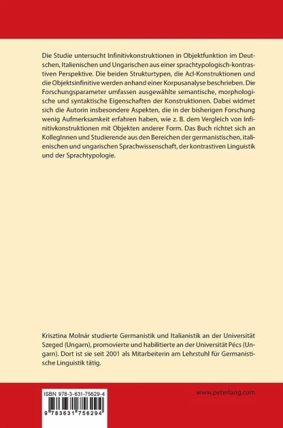 Die Studie untersucht Infinitivkonstruktionen in Objektfunktion im Deutschen, Italienischen und Ungarischen aus einer sprachtypologisch-kontrastiven Perspektive. Die beiden Strukturtypen, die AcI-Konstruktionen und die Objektsinfinitive werden anhand einer Korpusanalyse beschrieben. Die Forschungsparameter umfassen ausgewählte semantische, morphologische und syntaktische Eigenschaften der Konstruktionen. Dabei widmet sich die Autorin insbesondere Aspekten, die in der bisherigen Forschung wenig Aufmerksamkeit erfahren haben, wie z. B. dem Vergleich von Infinitivkonstruktionen mit Objekten anderer Form. Das Buch richtet sich an KollegInnen und Studierende aus den Bereichen der germanistischen, italienischen und ungarischen Sprachwissenschaft, der kontrastiven Linguistik und der Sprachtypologie.