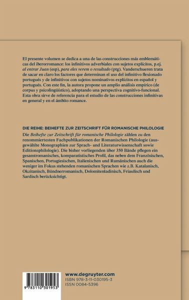 El presente volumen se dedica a una de las construcciones más emblemáticas del ámbito iberorromance: los infinitivos adverbiales con sujetos explícitos, p.ej. al entrar Juan (esp), para eles verem o resultado (ptg). Aspira a llenar una laguna empírica y a dar un análisis cognitivo-funcional y comparativo de estas construcciones.