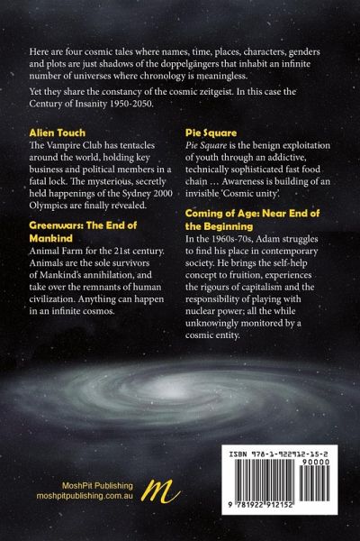 The 2 tomes, Infinity of Zeitgeist Doppelgangers and The Compleat OWL: The Forever Zeitgeist 1950-2050, have been created primarily for a reader-market who hasn't been born yet. Through the lens of satire they will read about the thoughts, beliefs and aspirations of those who lived in our 'Century of Insanity', 1950-2050. But current generations might also be interested in learning what all 'our' thoughts are 'now' according to the psychologist author. Hubris, (individual and species) will take a back seat to enlightenment as ordinary characters wrestle with intuitive realisations of infinite cosmic evolution to 'perfect intelligence.' It's also a literary phenomenon which places Australia, the little big country, in the global headlight. The two books, a combined sixteen hundred plus pages, are not created to just facilitate further thought and discussion but to galvanise real action to address obvious global social injustices and resource imbalances. For readers alive in our current epoch, in this Century of Insanity, the target reader market is Baby Boomers; especially those who might be feeling guilty about the way civilisation has ended up under their watch. Infinity of Zeitgeist Doppelgangers - Volume One Here are four cosmic tales where names, time, places, characters, genders and plots are, in one sense, arbitrary. They are just shadows of the doppelgängers that inhabit an infinite number of universes where chronology is meaningless. Yet they share the constancy of the cosmic zeitgeist. In this case the Century of Insanity 1950-2050. Alien Touch The Vampire Club has tentacles around the world, holding key business and political members in a fatal lock. The mysterious, secretly held happenings of the Sydney 2000 Olympics are finally revealed. Greenwars: The End of Mankind Animal Farm for the 21st century. Animals are the sole survivors of Mankind's annihilation, and take over the remnants of human civilization. Anything can happen in an infinite cosmos. Pie Square Pie Square is the benign exploitation of youth through an addictive, technically sophisticated fast food chain ... Awareness is building of an invisible 'Cosmic unity'. Coming of Age: Near End of the Beginning In the 1960s-70s, young Adam struggles to find his place in contemporary society. He brings the self-help concept to fruition, experiences the rigours of capitalism and the responsibility of playing with nuclear power; all the while unknowingly monitored by a cosmic entity.This literary phenomenon starts the Australian journey from 'good ideas' to Global leadership ... and far beyond!