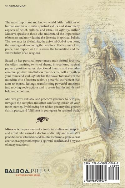The most important and known world faith traditions of humankind have similar spiritual values and share many aspects of belief, culture, and ritual. In Infinity, author Minerva speaks to those who understand the importance of oneness and unity despite the diversity in spiritual beliefs. The reverence for the infinite, the universal God of your heart, the wanting and promoting the need for collective unity, love, peace, and respect for life is across the foundation and the shared belief of all religions. Based on her personal experiences and spiritual journey, she offers inspiring twirls of rhyme, invocations, magical prayers, positive verses, devotional hymns, and everyday common positive mindfulness remedies that will strengthen your mind and soul. Infinity has the power to transform the mundane into a fantastic realm, a powerful instrument that aims to express feelings, transforming powerful emotions into moving noble actions and to create healthy minds and balanced emotions. Minerva gives valuable and practical guidance to help you navigate the complex and often confusing terrain of your inner journey. By following her advice, you may find greater clarity, peace, and fulfilment in your quest for spiritual truth.