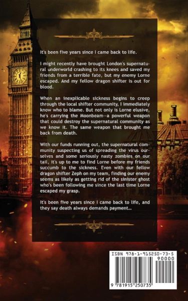 It's been five years since I came back to life. I might recently have brought London's supernatural underworld crashing to its knees and saved my friends from a terrible fate, but my enemy Lorne escaped. And my fellow dragon shifter is out for blood. When an inexplicable sickness begins to creep through the local shifter community, I immediately know who to blame. But not only is Lorne elusive, he's carrying the Moonbeam -- a powerful weapon that could destroy the supernatural community as we know it. The same weapon that brought me back from death. With our funds running out, the supernatural community suspecting us of spreading the virus ourselves and some seriously nasty zombies on our tail, it's up to me to find Lorne before my friends succumb to the sickness. Even with our fellow dragon shifter Zeph on my team, finding our enemy seems as likely as getting rid of the sinister ghost who's been following me since the last time Lorne escaped my grasp. It's been five years since I came back to life, and they say death always demands payment...
