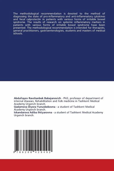 The methodological recommendation is devoted to the method of diagnosing the state of pro-inflammatory and anti-inflammatory cytokines and fecal calprotectin in patients with various forms of irritable bowel syndrome. The results of research on systemic inflammatory markers in patients with various forms of irritable bowel syndrome have been presented. The methodological recommendation is intended for therapists, general practitioners, gastroenterologists, students and masters of medical schools.
