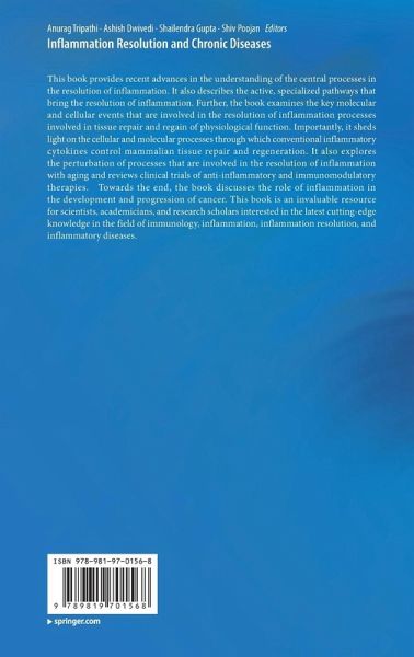 Chapter 1_Overview of Inflammation.-Chapter 2_Risk factors associated with inflammation and management strategies.-Chapter 3_Cellular signalling in inflammation.-Chapter 4_Players of Inflammation in the Containment of Intracellular Infections.-Chapter 5_Regulation of T cell response in inflammation from killing to healing.-Chapter 6_Role of Inflammation in Tissue Regeneration and Repair.-Chapter 7_Inflammation and cancer.-Chapter 8_Inflammation resolution: Future Prospects and advancements in technologies.-Chapter 9_Are multi-component drugs better in resolving the inflammation compared to the single component drugs? .- Chapter 10_Effect of ageing on Inflammation Resolution.- Chapter 11_Multi-omics data integration in understanding inflammation and inflammation resolution.- Chapter 12_Clinical trials and outcomes in anti-inflammatory therapies.- Chapter 13_Mechanistic understanding of inflammation resolution using the Atlas of Inflammation Resolution (AIR).