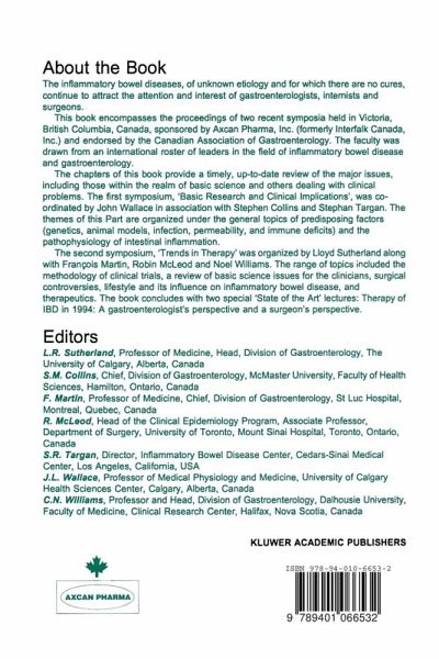 The inflammatory bowel diseases, of unknown etiology and for which there are no cures, continue to attract the attention and interest of gastroenterologists, internists and surgeons. International symposia are common and it is safe to say that there is at least one major symposium held somewhere in the world each year. This book encompasses the proceedings of two recent symposia held in Victoria, British Columbia, Canada. The symposia were the fifth and sixth international meetings focused on inflammatory bowel disease in Canada in the last eight years. Once again they were sponsored by Axcan Pharma, Inc. (formerly Interfalk Canada, Inc.) and endorsed by the Canadian Association of Gastroenterology. As has become traditional at such meetings the faculty was drawn from an international roster ofleaders in the field of inflammatory bowel disease and gastroenterology. The chapters of the proceedings provide a timely, up-to-date review of the major issues, including those within the realm of basic science and others dealing with clinical problems. The first symposium, 'Basic Research and Clinical Implications', was co-ordinated by John Wallace in association with Stephen Collins and Stephan Targan. The themes of this section were organized under the general topics of predisposing factors (genetics, animal models, infection, permeability, and immune deficits) and the pathophysiology of intestinal inflammation. The second symposium, Trends in Therapy' was organized by Lloyd Sutherland along with Franc;:ois Martin, Robin McLeod and Noel Williams.