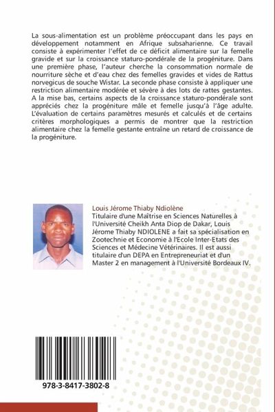 La sous-alimentation est un problème préoccupant dans les pays en développement notamment en Afrique subsaharienne. Ce travail consiste à expérimenter l'effet de ce déficit alimentaire sur la femelle gravide et sur la croissance staturo-pondérale de la progéniture. Dans une première phase, l'auteur cherche la consommation normale de nourriture sèche et d'eau chez des femelles gravides et vides de Rattus norvegicus de souche Wistar. La seconde phase consiste à appliquer une restriction alimentaire modérée et sévère à des lots de rattes gestantes. A la mise bas, certains aspects de la croissance staturo-pondérale sont appréciés chez la progéniture mâle et femelle jusqu'à l'âge adulte. L'évaluation de certains paramètres mesurés et calculés et de certains critères morphologiques a permis de montrer que la restriction alimentaire chez la femelle gestante entraîne un retard de croissance de la progéniture.