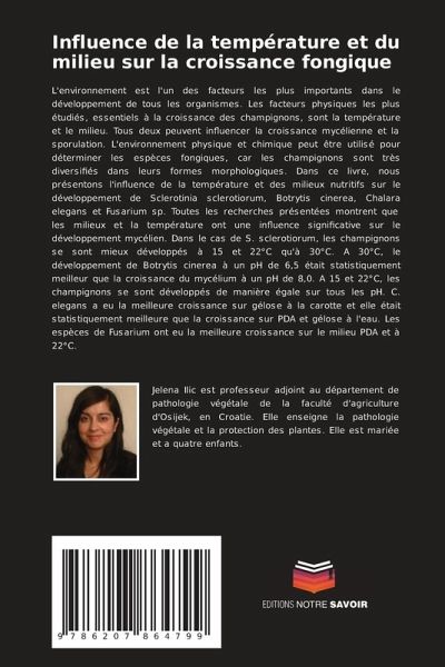L'environnement est l'un des facteurs les plus importants dans le développement de tous les organismes. Les facteurs physiques les plus étudiés, essentiels à la croissance des champignons, sont la température et le milieu. Tous deux peuvent influencer la croissance mycélienne et la sporulation. L'environnement physique et chimique peut être utilisé pour déterminer les espèces fongiques, car les champignons sont très diversifiés dans leurs formes morphologiques. Dans ce livre, nous présentons l'influence de la température et des milieux nutritifs sur le développement de Sclerotinia sclerotiorum, Botrytis cinerea, Chalara elegans et Fusarium sp. Toutes les recherches présentées montrent que les milieux et la température ont une influence significative sur le développement mycélien. Dans le cas de S. sclerotiorum, les champignons se sont mieux développés à 15 et 22°C qu'à 30°C. A 30°C, le développement de Botrytis cinerea à un pH de 6,5 était statistiquement meilleur que la croissance du mycélium à un pH de 8,0. A 15 et 22°C, les champignons se sont développés de manière égale sur tous les pH. C. elegans a eu la meilleure croissance sur gélose à la carotte et elle était statistiquement meilleure que la croissance sur PDA et gélose à l'eau. Les espèces de Fusarium ont eu la meilleure croissance sur le milieu PDA et à 22°C.