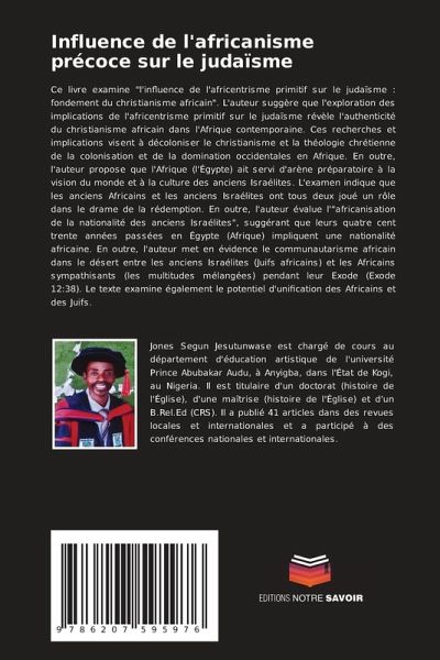 Ce livre examine "l'influence de l'africentrisme primitif sur le judaïsme : fondement du christianisme africain". L'auteur suggère que l'exploration des implications de l'africentrisme primitif sur le judaïsme révèle l'authenticité du christianisme africain dans l'Afrique contemporaine. Ces recherches et implications visent à décoloniser le christianisme et la théologie chrétienne de la colonisation et de la domination occidentales en Afrique. En outre, l'auteur propose que l'Afrique (l'Égypte) ait servi d'arène préparatoire à la vision du monde et à la culture des anciens Israélites. L'examen indique que les anciens Africains et les anciens Israélites ont tous deux joué un rôle dans le drame de la rédemption. En outre, l'auteur évalue l'"africanisation de la nationalité des anciens Israélites", suggérant que leurs quatre cent trente années passées en Égypte (Afrique) impliquent une nationalité africaine. En outre, l'auteur met en évidence le communautarisme africain dans le désert entre les anciens Israélites (Juifs africains) et les Africains sympathisants (les multitudes mélangées) pendant leur Exode (Exode 12:38). Le texte examine également le potentiel d'unification des Africains et des Juifs.