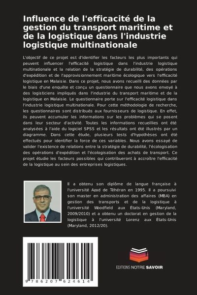L'objectif de ce projet est d'identifier les facteurs les plus importants qui peuvent influencer l'efficacité logistique dans l'industrie logistique multinationale et la relation de la stratégie de durabilité, des opérations d'expédition et de l'approvisionnement maritime écologique vers l'efficacité logistique en Malaisie. Dans ce projet, nous avons recueilli des données par le biais d'une enquête et conçu un questionnaire que nous avons envoyé à des logisticiens impliqués dans l'industrie du transport maritime et de la logistique en Malaisie. Le questionnaire porte sur l'efficacité logistique dans l'industrie logistique multinationale. Pour cette méthodologie de recherche, les questionnaires sont distribués aux fournisseurs de logistique. En effet, ils peuvent accumuler les informations sur les problèmes qui se posent dans leur secteur d'activité. Toutes les informations recueillies ont été analysées à l'aide du logiciel SPSS et les résultats ont été illustrés par un diagramme. Dans cette étude, plusieurs tests d'hypothèses ont été effectués pour identifier la force de ces variables. Nous avons essayé de valider l'existence de relations entre la stratégie de durabilité, l'écologisation des opérations d'expédition et l'écologisation des achats de transport. Ce projet étudie les facteurs possibles qui contribueront à accroître l'efficacité de la logistique au sein des entreprises logistiques.