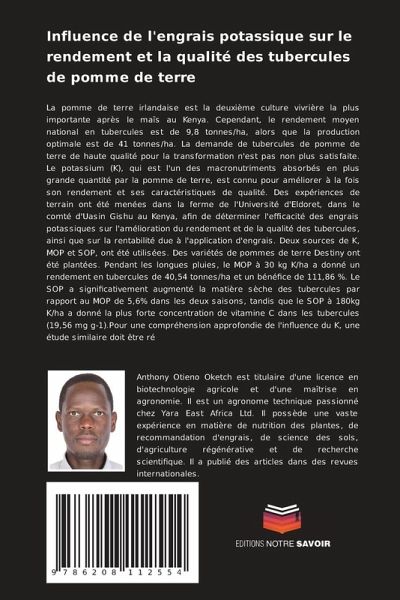 La pomme de terre irlandaise est la deuxième culture vivrière la plus importante après le maïs au Kenya. Cependant, le rendement moyen national en tubercules est de 9,8 tonnes/ha, alors que la production optimale est de 41 tonnes/ha. La demande de tubercules de pomme de terre de haute qualité pour la transformation n'est pas non plus satisfaite. Le potassium (K), qui est l'un des macronutriments absorbés en plus grande quantité par la pomme de terre, est connu pour améliorer à la fois son rendement et ses caractéristiques de qualité. Des expériences de terrain ont été menées dans la ferme de l'Université d'Eldoret, dans le comté d'Uasin Gishu au Kenya, afin de déterminer l'efficacité des engrais potassiques sur l'amélioration du rendement et de la qualité des tubercules, ainsi que sur la rentabilité due à l'application d'engrais. Deux sources de K, MOP et SOP, ont été utilisées. Des variétés de pommes de terre Destiny ont été plantées. Pendant les longues pluies, le MOP à 30 kg K/ha a donné un rendement en tubercules de 40,54 tonnes/ha et un bénéfice de 111,86 %. Le SOP a significativement augmenté la matière sèche des tubercules par rapport au MOP de 5,6% dans les deux saisons, tandis que le SOP à 180kg K/ha a donné la plus forte concentration de vitamine C dans les tubercules (19,56 mg g-1).Pour une compréhension approfondie de l'influence du K, une étude similaire doit être ré