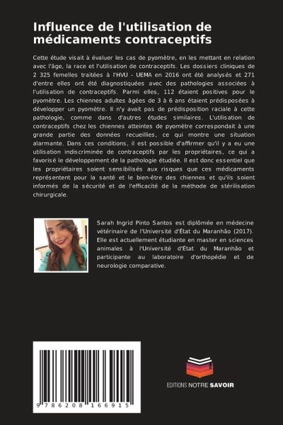 Cette étude visait à évaluer les cas de pyomètre, en les mettant en relation avec l'âge, la race et l'utilisation de contraceptifs. Les dossiers cliniques de 2 325 femelles traitées à l'HVU - UEMA en 2016 ont été analysés et 271 d'entre elles ont été diagnostiquées avec des pathologies associées à l'utilisation de contraceptifs. Parmi elles, 112 étaient positives pour le pyomètre. Les chiennes adultes âgées de 3 à 6 ans étaient prédisposées à développer un pyomètre. Il n'y avait pas de prédisposition raciale à cette pathologie, comme dans d'autres études similaires. L'utilisation de contraceptifs chez les chiennes atteintes de pyomètre correspondait à une grande partie des données recueillies, ce qui montre une situation alarmante. Dans ces conditions, il est possible d'affirmer qu'il y a eu une utilisation indiscriminée de contraceptifs par les propriétaires, ce qui a favorisé le développement de la pathologie étudiée. Il est donc essentiel que les propriétaires soient sensibilisés aux risques que ces médicaments représentent pour la santé et le bien-être des chiennes et qu'ils soient informés de la sécurité et de l'efficacité de la méthode de stérilisation chirurgicale.