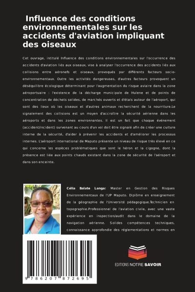 Cet ouvrage, intitulé Influence des conditions environnementales sur l'occurrence des accidents d'aviation liés aux oiseaux, vise à analyser l'occurrence des accidents liés aux collisions entre aéronefs et oiseaux, provoqués par différents facteurs socio-environnementaux. Outre les activités dangereuses, d'autres facteurs provoquent un déséquilibre écologique déterminant pour l'augmentation du risque aviaire dans la zone aéroportuaire : l'existence de la décharge municipale de Hulene et de points de concentration de déchets solides, de marchés ouverts et d'étals autour de l'aéroport, qui sont des lieux où les oiseaux et d'autres animaux recherchent de la nourriture.Le signalement des collisions est un moyen d'accroître la sécurité aérienne dans les aéroports et dans les zones environnantes. Il est un fait que chaque événement (accident/incident) survenant au cours d'un vol doit être signalé afin de créer une culture interne de la sécurité, d'aider à prévenir les accidents et d'améliorer les processus internes. L'aéroport international de Maputo présente un niveau de risque très élevé en ce qui concerne les espèces problématiques que sont le héron et la cigogne, dont la présence est liée aux points chauds existant dans la zone de sécurité de l'aéroport et dans son enceinte.