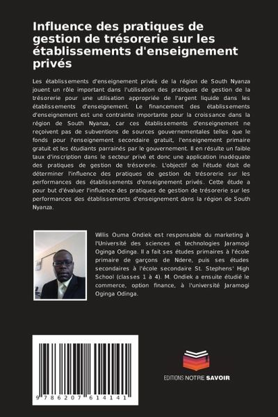 Les établissements d'enseignement privés de la région de South Nyanza jouent un rôle important dans l'utilisation des pratiques de gestion de la trésorerie pour une utilisation appropriée de l'argent liquide dans les établissements d'enseignement. Le financement des établissements d'enseignement est une contrainte importante pour la croissance dans la région de South Nyanza, car ces établissements d'enseignement ne reçoivent pas de subventions de sources gouvernementales telles que le fonds pour l'enseignement secondaire gratuit, l'enseignement primaire gratuit et les étudiants parrainés par le gouvernement. Il en résulte un faible taux d'inscription dans le secteur privé et donc une application inadéquate des pratiques de gestion de trésorerie. L'objectif de l'étude était de déterminer l'influence des pratiques de gestion de trésorerie sur les performances des établissements d'enseignement privés. Cette étude a pour but d'évaluer l'influence des pratiques de gestion de trésorerie sur les performances des établissements d'enseignement dans la région de South Nyanza.
