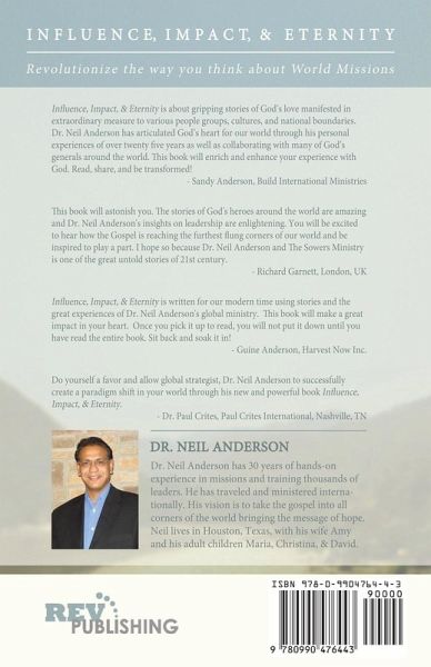 We often read or hear persons referring to their dreams or visions. Years ago, my wife, Linda, and I went to China to smuggle Bibles to our persecuted Christian brethren there. That trip providentially brought Neil Anderson and his family into our lives. The Lord clearly merged our lives to Neil and The Sowers Ministry for the purpose of reaching millions of people in the 10/40 window of the world with the Word of God. Over the years, we have been privileged to be a part of the Holy Spirit's reaching millions of the lost and saving them from eternal damnation. In addition, every year thousands of leaders are being discipled and trained to build strong churches. The Lord is calling his people to help train up a new generation of leaders--young men and women who have a clear call of God on their lives, sound biblical teaching, practical training, and leadership skills. These new leaders will help establish and build the kingdom of God upon the earth. They will usher in a new wave that will see millions won to Christ, churches planted, Bible schools established, and more leaders trained. By reading Influence, Impact & Eternity, leaders will be encouraged to train up the next generation of soul winners for Christ and plant churches. This book will give leaders the tools they need to influence and impact future generations for eternity. Linda and I ask you to seek the Lord as to your dreams and visions to fulfill the Lord's commitment to reach the lost and usher them into His Kingdom of Everlasting Life! Ray and Linda Goodrich New York