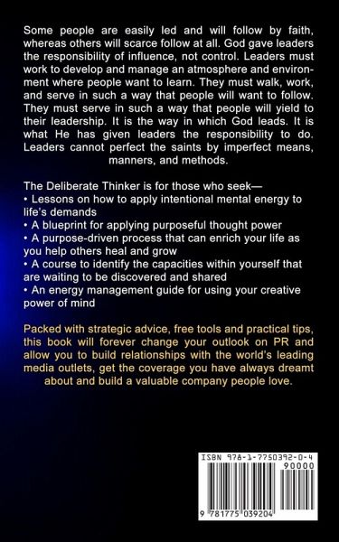 Some people are easily led and will follow by faith, whereas others will scarce follow at all. God gave leaders the responsibility of influence, not control. Leaders must work to develop and manage an atmosphere and environment where people want to learn. They must walk, work, and serve in such a way that people will want to follow. They must serve in such a way that people will yield to their leadership. It is the way in which God leads. It is what He has given leaders the responsibility to do. Leaders cannot perfect the saints by imperfect means, manners, and methods. The Deliberate Thinker is for those who seek-Lessons on how to apply intentional mental energy to life's demands A blueprint for applying purposeful thought power A purpose-driven process that can enrich your life as you help others heal and grow A course to identify the capacities within yourself that are waiting to be discovered and shared An energy management guide for using your creative power of mind Packed with strategic advice, free tools and practical tips, this book will forever change your outlook on PR and allow you to build relationships with the world's leading media outlets, get the coverage you have always dreamt about and build a valuable company people love.