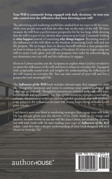 Your will is constantly being engaged with daily decisions. It's time you take control over the influences that have been directing your will! The advertising and marketing world have studied how we react to life for years, while most people turn and look the other way on the topic of the will. We have measured the will from a performance perspective for far too long while denying that the will is a part of our identity that connects us to God and constantly looking at what happens instead of examining why things happen. Becoming aware of the influences of the will allows us the freedom of pursuing God's will and our life's purpose. We no longer have to discuss free will without a clear perspective on how it relates to the responsibilities of freedom. It's time to begin using our will to create God's glory and call our purpose into order by acknowledging our dominion over our will and the relationships it engages. Hermon Cotton searches out the scriptures to explore what God has revealed to us about the influences of the will and how it relates to everyday life. This book is equipped with scripturally sound tools and insights for understanding the influences of the will's impact on everyday life. You can align your desires, plans, and motives with God's will for a purposeful and meaningful life. In this book, you will learn ¿ how the influences of the will impact your everyday life and shapes your destiny, ¿ how to understand how your will relates to God's plan on earth ¿ how the influences of the will can help you become the overcomer God called you to be, and ¿ how to align your will with the Holy Spirit and reflect God's glory. Plus, thoughtful moments are included with each main topic for reflection and application. The Thoughtful moments include a concluding concept, foundational scripture, and thoughtful questions that will reinforce your grasp on the influences on your will as you begin living to make God's glory known. God doesn't want you blind to marketing strategies that engage your will daily. He has already given you the identity of his child made in his image and likeness. So now it time to use our will like Jesus Christ, our model for aligning our will with God's will. So start reading your copy of Influences of the Will today and dive into a deeper understanding of your God-designed will as it relates to everyday life!