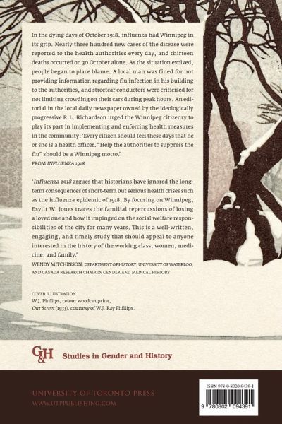 '"Influenza 1918" argues that historians have ignored the long-term consequences of short-term but serious health crises such as the influenza epidemic of 1918. By focusing on Winnipeg, Esyllt W. Jones traces the familiar repercussions of losing a loved one and how it impinged on the social welfare responsibilities of the city for many years. This is a well written, engaging, and timely study that should appeal to anyone interested in the history of the working class, women, medicine, and family.'-Wendy Mitchinson, Department of History, University of Waterloo and Canada Research Chair in Gender and Medical History