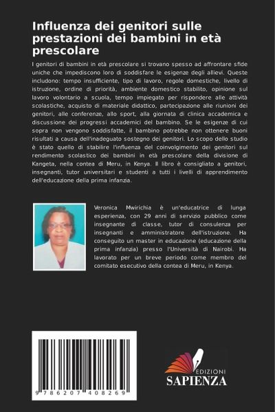 I genitori di bambini in età prescolare si trovano spesso ad affrontare sfide uniche che impediscono loro di soddisfare le esigenze degli allievi. Queste includono: tempo insufficiente, tipo di lavoro, regole domestiche, livello di istruzione, ordine di priorità, ambiente domestico stabilito, opinione sul lavoro volontario a scuola, tempo impiegato per rispondere alle attività scolastiche, acquisto di materiale didattico, partecipazione alle riunioni dei genitori, alle conferenze, allo sport, alla giornata di clinica accademica e discussione dei progressi accademici del bambino. Se le esigenze di cui sopra non vengono soddisfatte, il bambino potrebbe non ottenere buoni risultati a causa dell'inadeguato sostegno dei genitori. Lo scopo dello studio è stato quello di stabilire l'influenza del coinvolgimento dei genitori sul rendimento scolastico dei bambini in età prescolare della divisione di Kangeta, nella contea di Meru, in Kenya. Il libro è consigliato a genitori, insegnanti, tutor universitari e studenti a tutti i livelli di apprendimento dell'educazione della prima infanzia.