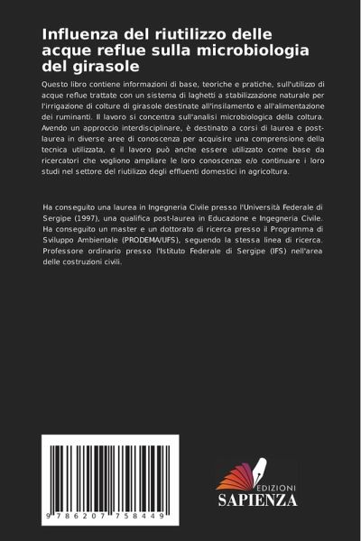 Questo libro contiene informazioni di base, teoriche e pratiche, sull'utilizzo di acque reflue trattate con un sistema di laghetti a stabilizzazione naturale per l'irrigazione di colture di girasole destinate all'insilamento e all'alimentazione dei ruminanti. Il lavoro si concentra sull'analisi microbiologica della coltura. Avendo un approccio interdisciplinare, è destinato a corsi di laurea e post-laurea in diverse aree di conoscenza per acquisire una comprensione della tecnica utilizzata, e il lavoro può anche essere utilizzato come base da ricercatori che vogliono ampliare le loro conoscenze e/o continuare i loro studi nel settore del riutilizzo degli effluenti domestici in agricoltura.