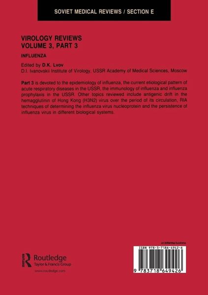 First published in 1990. Part three is devoted to the epidemiology of influenza, the current etiological pattern of acute respiratory diseases in the USSR, the immunology of flu and of influenza and influenza prophylaxis in the USSR. Other topics reviewed include antigenic drift in the hemagglutinin of Hong Kong [H3N2] virus over the period of its circulation, RIA techniques of determining the influenza virus nucleoprotein and the persistence of influenza virus in different biological systems.