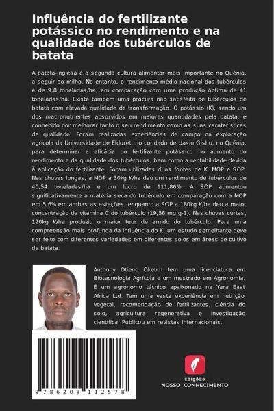 A batata-inglesa é a segunda cultura alimentar mais importante no Quénia, a seguir ao milho. No entanto, o rendimento médio nacional dos tubérculos é de 9,8 toneladas/ha, em comparação com uma produção óptima de 41 toneladas/ha. Existe também uma procura não satisfeita de tubérculos de batata com elevada qualidade de transformação. O potássio (K), sendo um dos macronutrientes absorvidos em maiores quantidades pela batata, é conhecido por melhorar tanto o seu rendimento como as suas caraterísticas de qualidade. Foram realizadas experiências de campo na exploração agrícola da Universidade de Eldoret, no condado de Uasin Gishu, no Quénia, para determinar a eficácia do fertilizante potássico no aumento do rendimento e da qualidade dos tubérculos, bem como a rentabilidade devida à aplicação do fertilizante. Foram utilizadas duas fontes de K: MOP e SOP. Nas chuvas longas, a MOP a 30kg K/ha deu um rendimento de tubérculos de 40,54 toneladas/ha e um lucro de 111,86%. A SOP aumentou significativamente a matéria seca do tubérculo em comparação com a MOP em 5,6% em ambas as estações, enquanto a SOP a 180kg K/ha deu a maior concentração de vitamina C do tubérculo (19,56 mg g-1). Nas chuvas curtas, 120kg K/ha produziu o maior teor de amido do tubérculo. Para uma compreensão mais profunda da influência do K, um estudo semelhante deve ser feito com diferentes variedades em diferentes solos em áreas de cultivo de batata.
