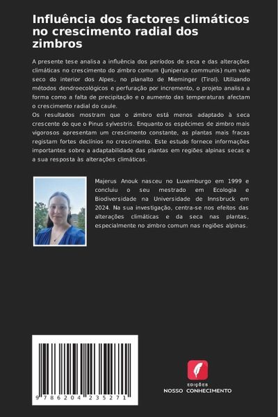 A presente tese analisa a influência dos períodos de seca e das alterações climáticas no crescimento do zimbro comum (Juniperus communis) num vale seco do interior dos Alpes, no planalto de Mieminger (Tirol). Utilizando métodos dendroecológicos e perfuração por incremento, o projeto analisa a forma como a falta de precipitação e o aumento das temperaturas afectam o crescimento radial do caule.Os resultados mostram que o zimbro está menos adaptado à seca crescente do que o Pinus sylvestris. Enquanto os espécimes de zimbro mais vigorosos apresentam um crescimento constante, as plantas mais fracas registam fortes declínios no crescimento. Este estudo fornece informações importantes sobre a adaptabilidade das plantas em regiões alpinas secas e a sua resposta às alterações climáticas.